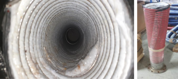 2019年年底,Novus技术团队接到该客户的技术咨询,有几根从2016年开始用来输送苯乙烯的6寸的软管,靠近法兰接头处的管体有变硬现象,但是按照试压流程打压不发生泄漏。客户现场操作工程师在之前从未见过类似的情况,想咨询我们技术团队,该软管变硬可能的原因以及继续使用这类软管的安全性能。