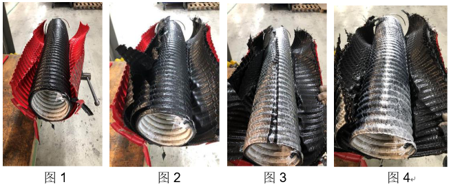 一层一层去除,直到最内侧的钢丝骨架为止。 所有层均因固化的苯乙烯粘合在一起。 从以下图片可以清楚地看到,内衬层已经严重损坏,内钢圈也移位了。 由于内衬层已发生损坏,介质已经能够穿透阻挡层,往外一层层渗透。