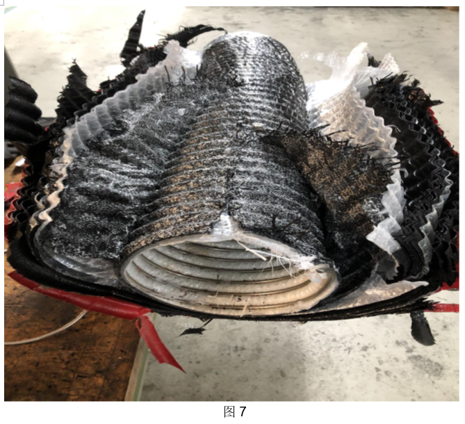 这些层彼此堆叠,在这些层之间存在介质, 编织层以及薄膜层几乎被介质完全粘合, 这就是为什么管体出现坚硬而失去柔韧性的原因。通过辅助设备,我们仍可以除去织物和薄膜,并能看到各层之间的苯乙烯介质,如图片7所示。苯乙烯已固化,这是液体苯乙烯遇到高温和氧气时的物理特性, 这种介质具有聚合能力,并可以从液态变成固态,这种介质在各层之间均可发现,而且也沉积在最内侧的ECTFE内衬上。
