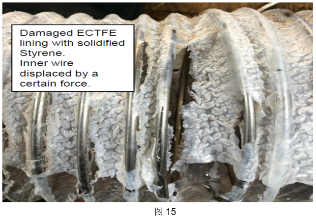 由于苯乙烯固化(乙烯聚合),因此有恒定的力作用在相邻的内钢圈上,使其发生位移变化,图911可以很清晰地看到这种情况。另外,在ECTFE内衬上也可以发现积聚的聚苯乙烯固体。 (图片15